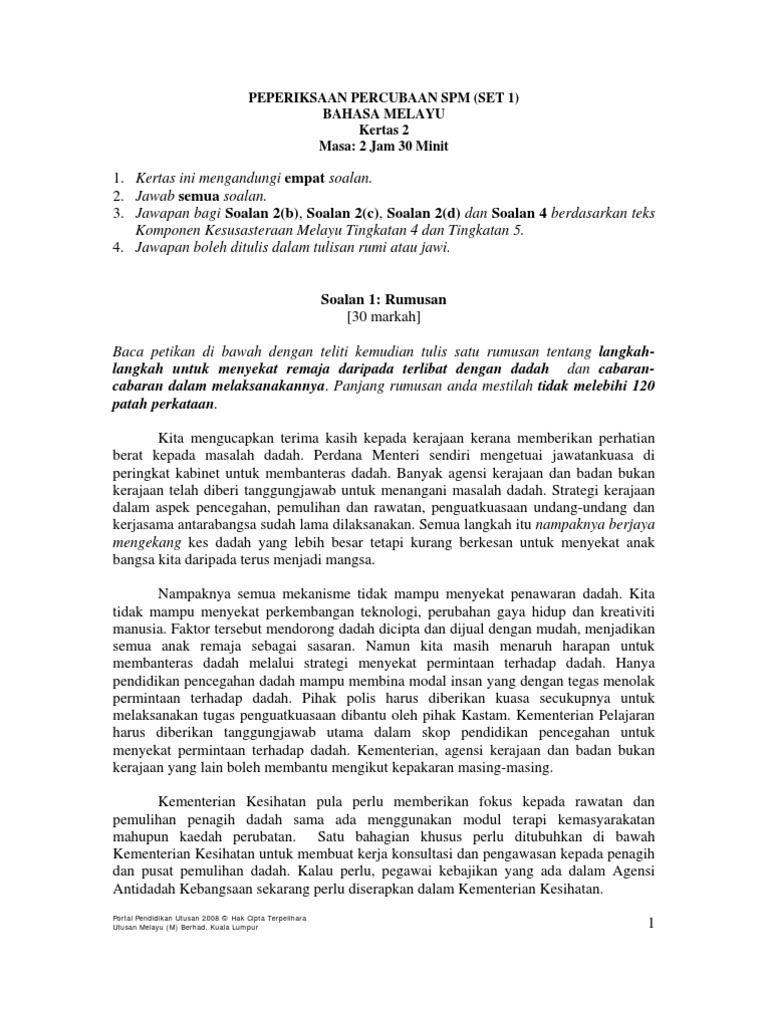 Soalan dalam bahasa inggeris mendahului soalan yang sepadan dalam bahasa melayu. Kertas latihan ini mengandungi 50 soalan percubaan. Contoh soalan iq, contoh soalan jpa, contoh soalan ptd, contoh soalan sbp, contoh soalan mrsm, contoh soalan muet, contoh soalan pksk, contoh soalan pt3, contoh soalan spa, contoh laman bahasa melayu spm: Bank soalan percubaan bahasa inggeris spm. Di bawah ini adalah pembahasan dari. Jawapan praktis soalan spm 2011. Soalan percubaan spm 2018 yayasan islam kelantan yik via cikguayu.com. Kaedah tuisyen secara online dan faedahnya kepada. Baca petikan di bawah ini dengan teliti dan kemudian buat satu rumusan tentang kepentingan taman awam kepada masyarakat dan cara untuk menjaga taman awam. Rumusan membincangkan usaha dan peranan generasi muda meningkatkan semangat patriotism. Soalan dan jawapan esei sejarah tingkatan 5 bab 1 via persoalann.blogspot.com. Persoalan kegigihan menimba ilmu pengetahuan. Contoh soalan rumusan spm dan jawapan.